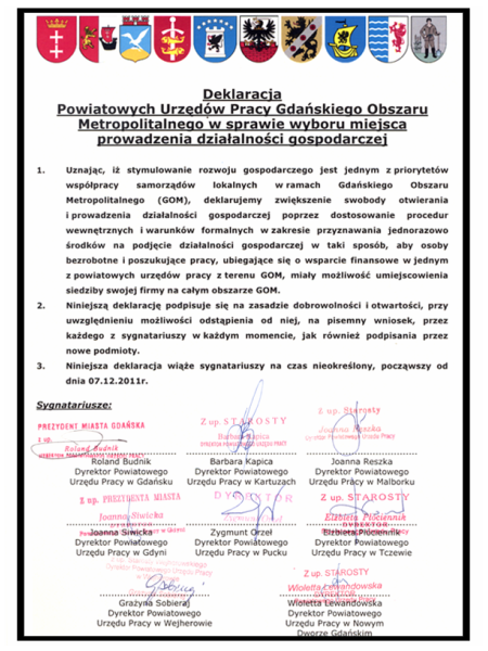 7 grudnia podpisana została także wspólna deklaracja o swobodzie wyboru miejsca prowadzenia działalności gospodarczej. Dzięki temu osoby bezrobotne, które będą skutecznie ubiegać się o przyznanie środków na otworzenie własnej działalności gospodarczej np. w PUP w Tczewie, będą mogły bez przeszkód otworzyć swoją firmę w Gdańsku, Malborku czy Wejherowie.
